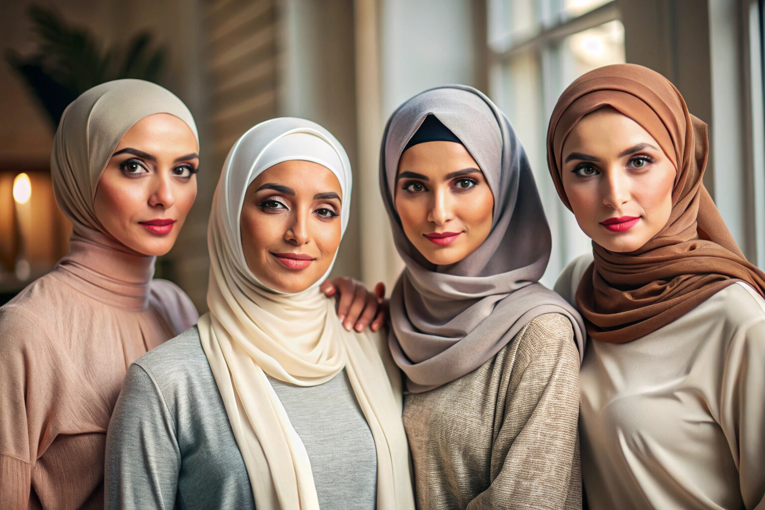 A diverse group of Muslim women smiling and interacting in a cozy boutique setting, surrounded by racks of elegant clothing in neutral tones, with soft natural lighting creating a warm and inviting atmosphere.